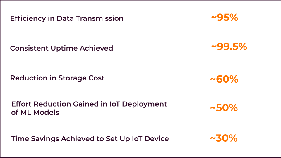 Comprehensive Platform Support and scalability: The customer realized the flexibility to use a plethora of devices that can run AWS Greengrass according to their business needs. The serverless infrastructure has also increased agility and scalability.